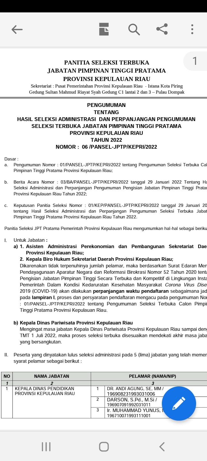 Tanjungpinang (infoluarbiasa.com)-Sebanyak 13 aparatur sipil negara (ASN) dinyatakan lolos administrasi pada lima jabatan eselon II, yakni Kepala Dinas (Kadis)...